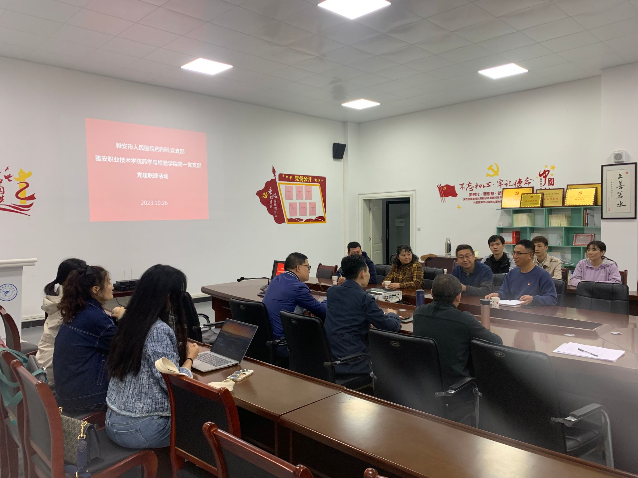 为深入贯彻落实党的二十大精神,积极探索校企合作,2023年10月26日下午,雅安市人民医院药剂科党支部来校与永利集团304官网第一党支部联合开展“党建+业务”联建活动。此次党建联建活动在经开区校区药检公司会议室举行,两支部共计15名党员同志参加。