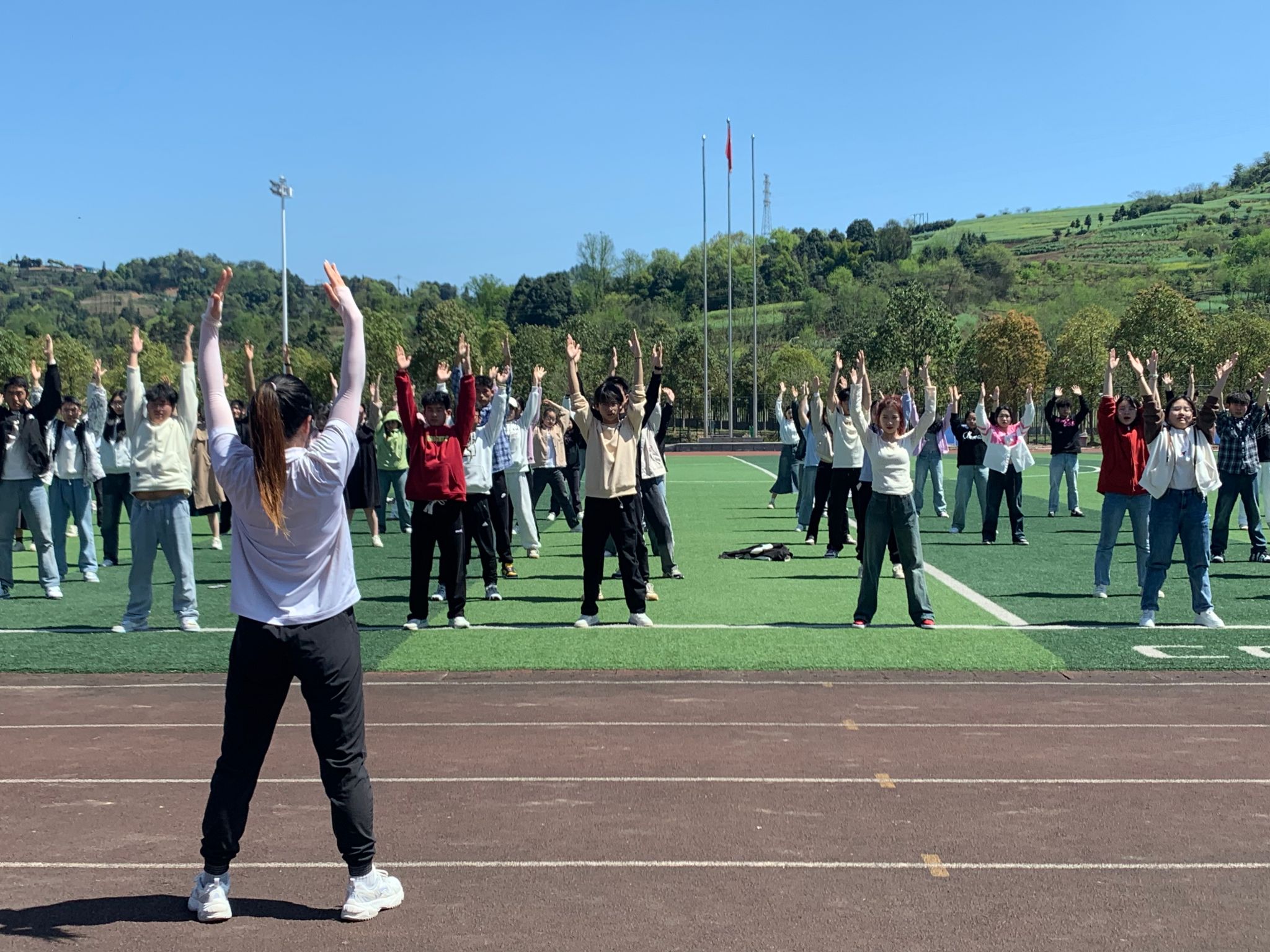 为进一步宣传普及心理健康知识,增强员工心理健康意识,促进员工身心健康发展,教给员工放松身心的方式方法,实现“体育强心”心理育人目标,2024年3月28日,永利集团304官网“暖阳”心理辅导站成员华君蓉老师在经开区足球场组织同学们学习中国气功“八段锦”。百余名员工包括各班心理委员和“暖阳”心理辅导站的老师们参加了本次学习活动。