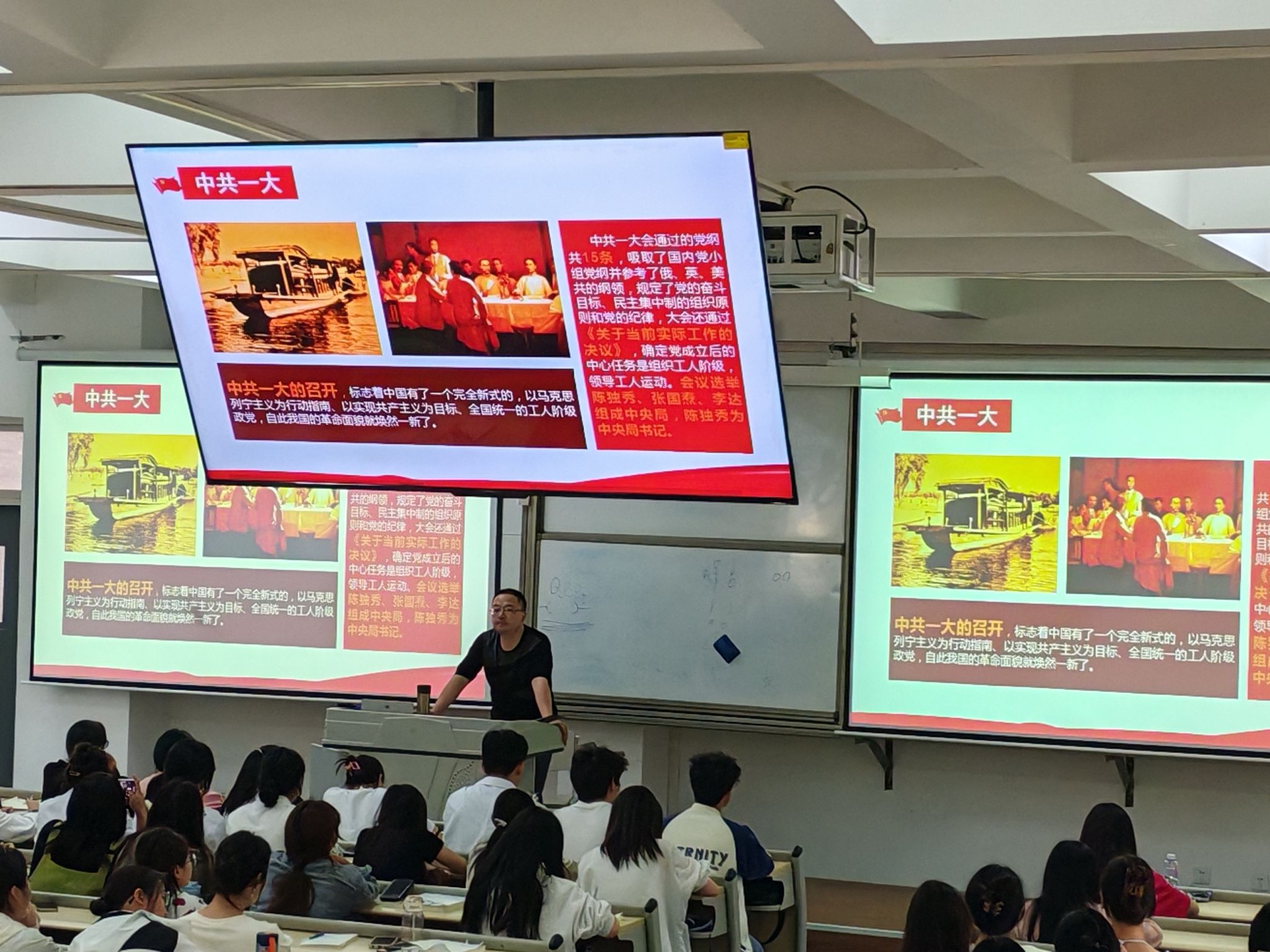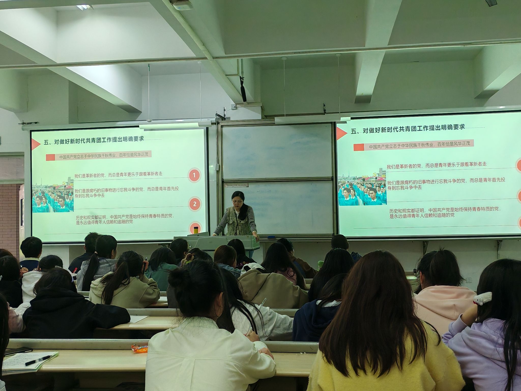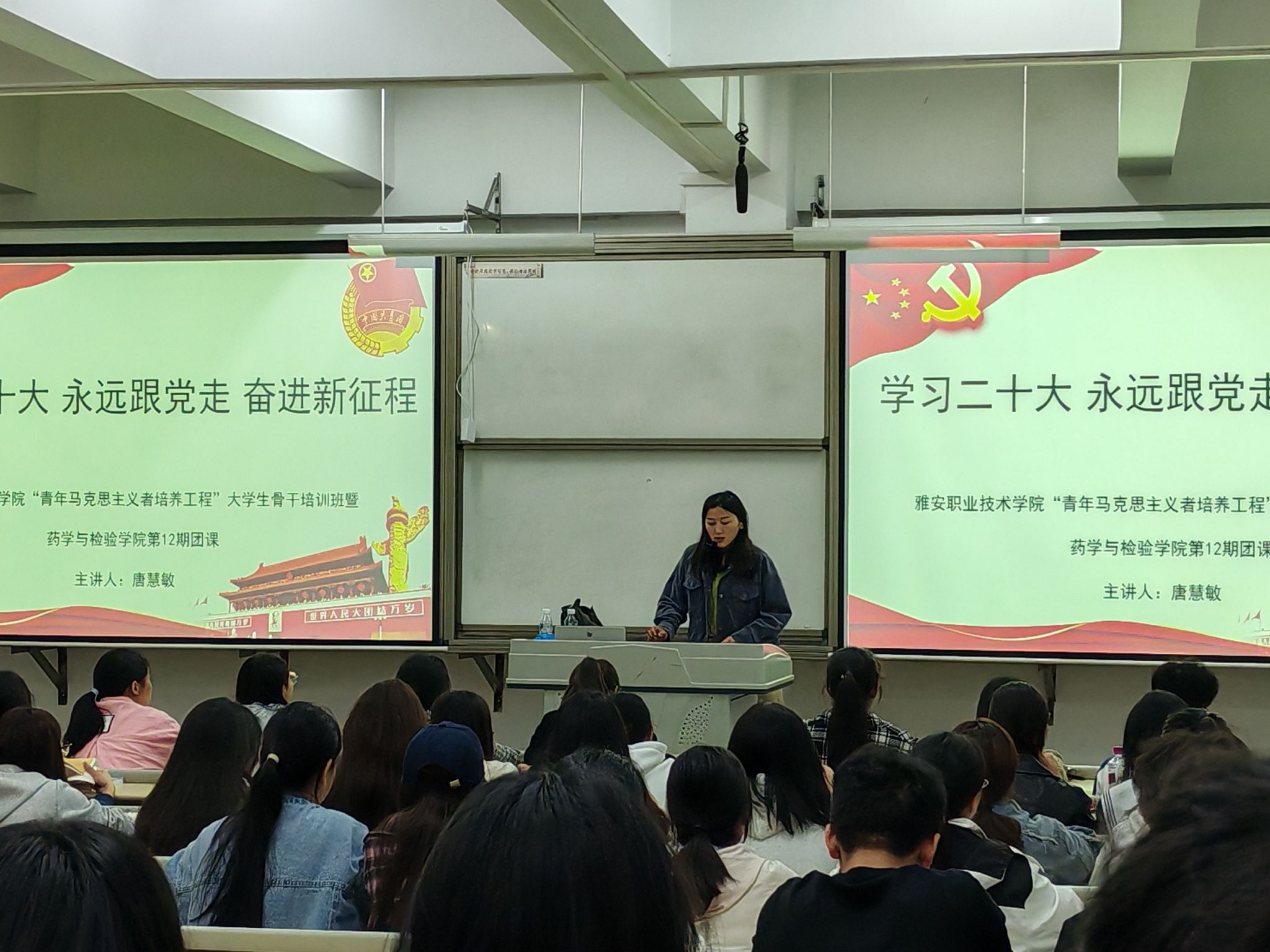 在整个培训中,王伟才书记带领大家共同回顾了从中国共产党的诞生到全国第一次人民代表大会的历史,并向大家详细解读了从马克思主义对中国共产党领导的影响到五四运动和新文化运动的意义,还结合相关视频将党波澜壮阔的历史进程充分展现,令同学们感受至深。鲜敏老师先为大家介绍了团课的课程安排及流程,然后带领全体同学奏唱共青团团歌,并进行入团宣誓。为使同学们坚定理想信念,争做时代青年,鲜敏老师从理想信念的概述、树立正确崇高理想信念的意义着手,通过一个个优秀事例为同学们讲述了青年一代应当如何树立理想信念,争做新时代的新青年。唐慧敏老师为同学们详细讲述了按时完成青年大学习的重要意义,解答了同学们在“三会两制一课”存在的有关问题,并对主题团日活动的开展做出了明确要求,并通过列举优秀学子的事迹,告诉同学们要敢于拼搏奋斗,只有敢想敢做,才能取得成功。针对网络安全问题,宋杨胤老师从网络安全的概念、特点与类型出发,通过身边的真实事例,为同学们讲述了重视网络安全的重要性和必要性,强调注重保护个人隐私的同时要有明辨网络信息的能力,然后就新闻稿撰写、图片的格式做详细解说。芦珂老师先就中国共产主义青年团成立100周年大会做了介绍。然后带领同学们学习了习近平总书记在共青团成立100周年大会上的重要讲话精神,并通过播放纪录片《与青春有关的日子》,回顾百年来的青春故事,切身感受青春特质。最后,通过小组汇报的形式,同学们分享学习内容,交流学习心得,为第十二期团课画上了圆满的句号。