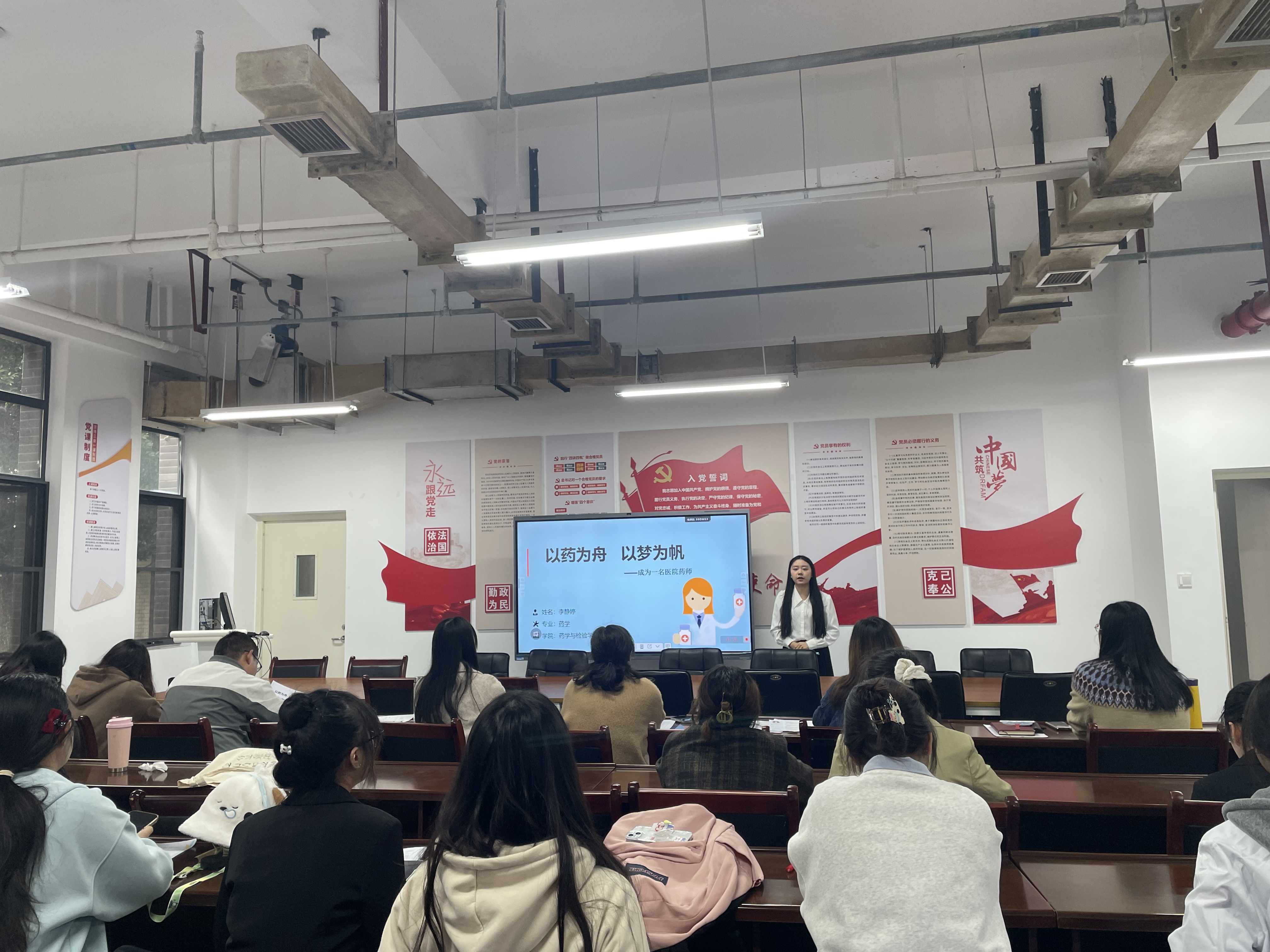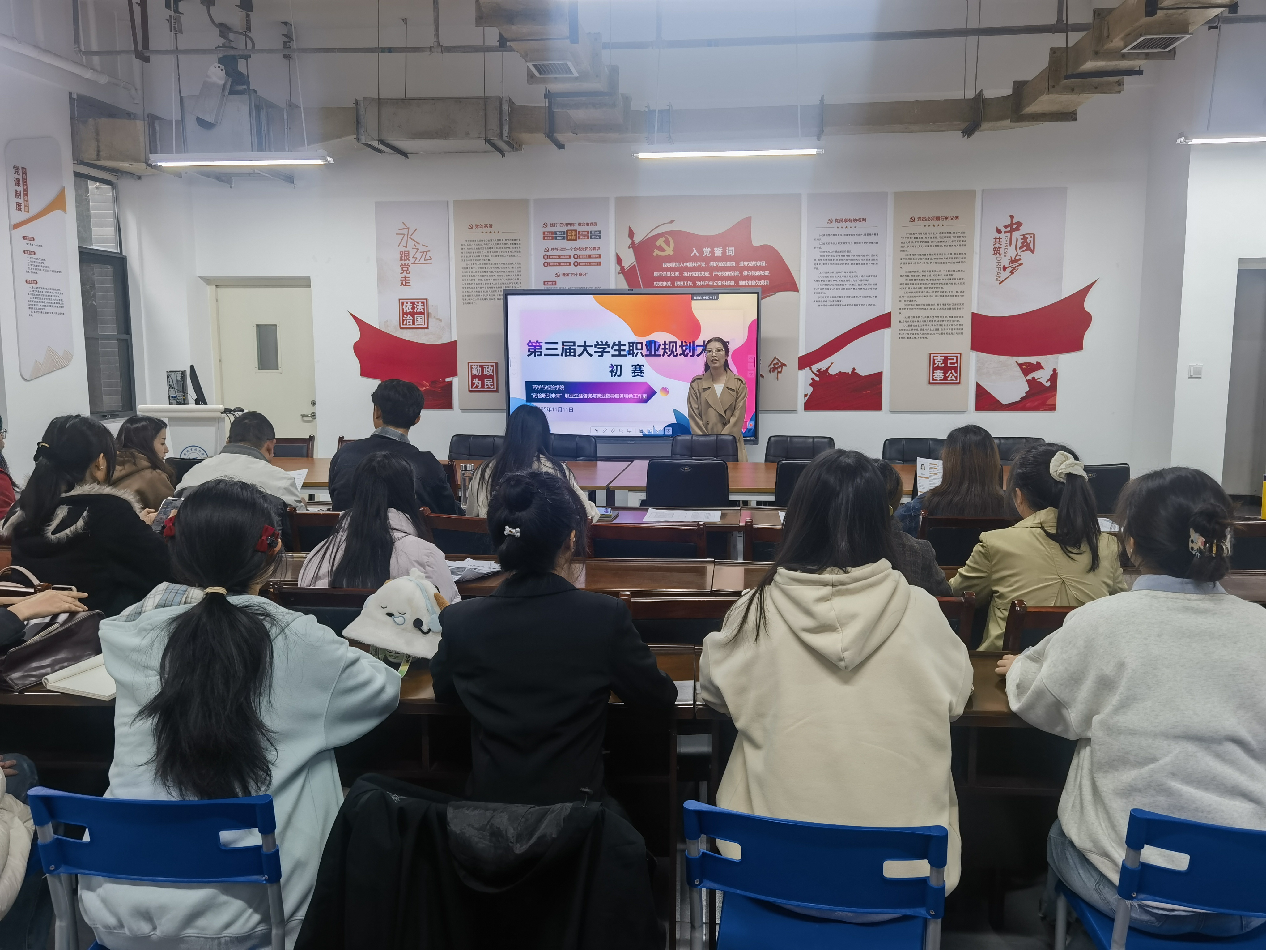 大赛共有385个项目进行了网报,经筛选,共22个项目进入了初赛。参赛选手依次上台,通过PPT演示、现场阐述等形式,清晰呈现职业目标、实施路径与成长规划。就业赛道选手聚焦具体岗位需求,结合实习经历、专业技能认证等内容,详细拆解自身与岗位的适配点,展现出扎实的专业功底和实践思考;成长赛道选手则立足行业发展与国家医药健康领域需求,将个人规划与产业升级、基层医疗服务等方向紧密结合,在阐述学习实践行动时逻辑清晰,对规划的动态优化思路具有前瞻性,充分体现了当代老员工的社会责任感与生涯发展智慧。全体选手精神饱满、表达流畅,展现出良好的沟通能力与临场应变素养,现场互动氛围热烈。