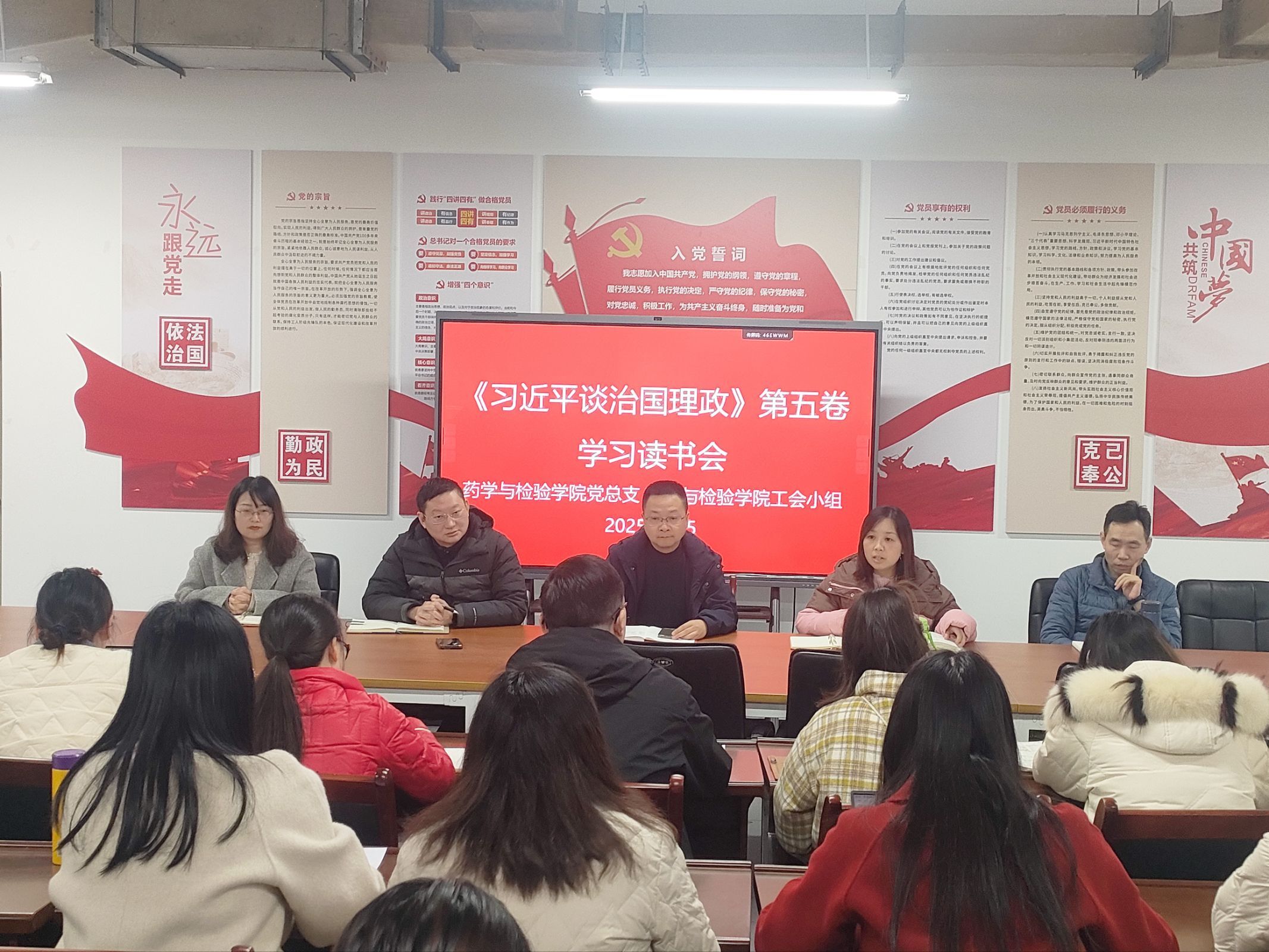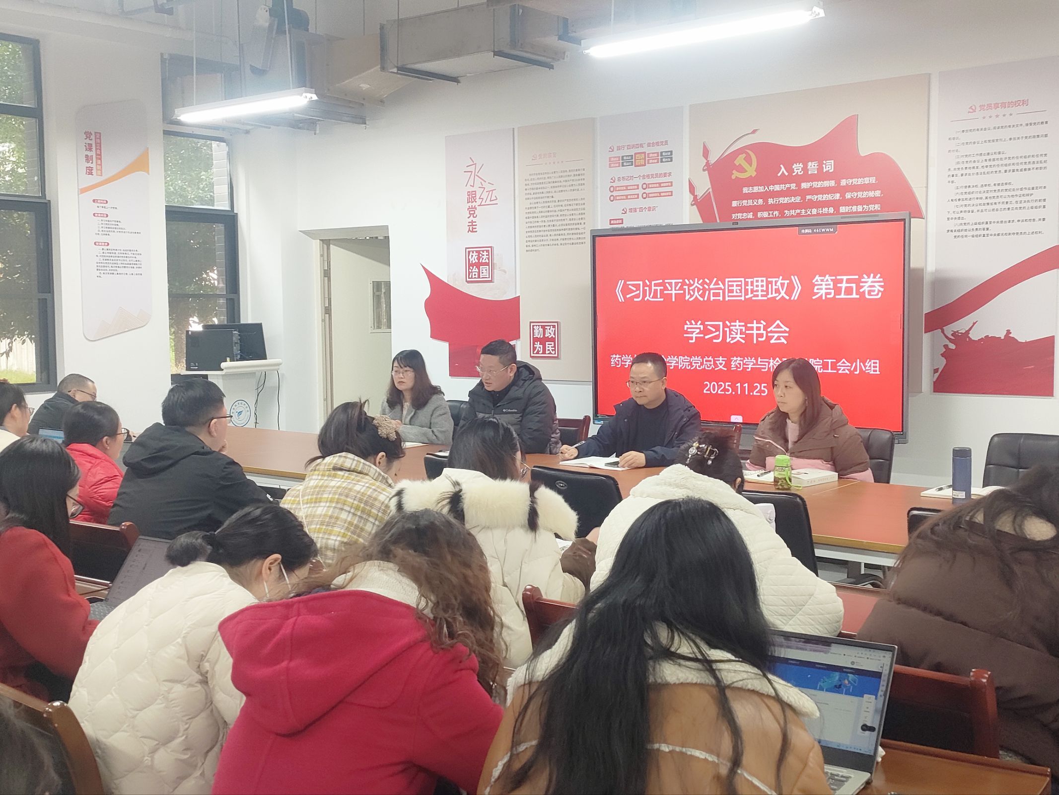 为深入学习贯彻习近平新时代中国特色社会主义思想,切实推动理论学习与专业实践深度融合,2025年11月25日永利集团304官网工会小组联合药学与检验公司党总支在经开校区药学与检验楼105会议室,组织全院61名教职工开展《习近平谈治国理政》第五卷学习读书会。