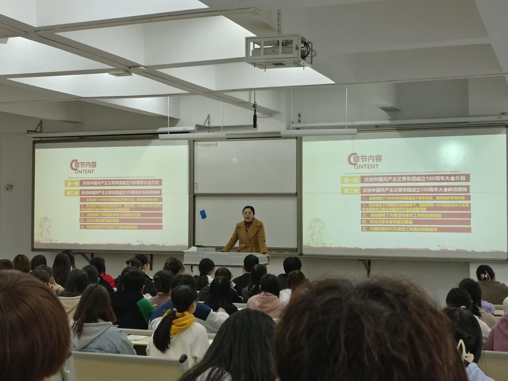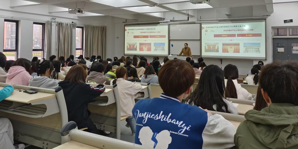 芦珂老师带领同学们在历史的长廊中遨游,回顾了百年来共青团坚定不移听党话、跟党走,最终创造百年荣光、续写时代华章的峥嵘岁月。她还向同学们讲述自己成长过程中与共青团的故事,用亲身经历告诉同学们共青团一路走来是多么不易。随后,芦珂老师深刻总结了共青团和青年工作的历史经验,向同学们传达了习近平总书记对当代青年寄予殷切期望,并对如何做好新时代共青团工作提出了明确要求。团课最后,芦珂老师还为同学们播放了“与青春有关的日子”中的片段,以此来激励同学们,不负韶华,砥砺奋进。