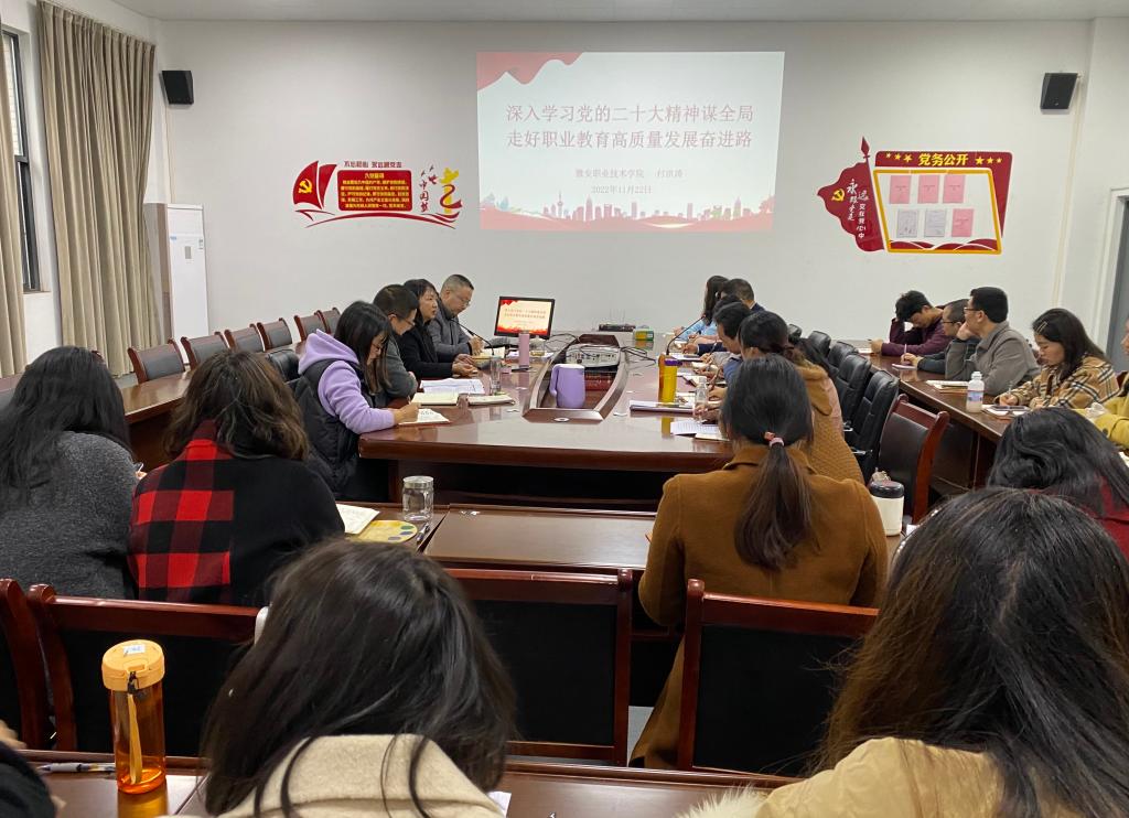 座谈会后,付洪涛同志作了党的二十大精神宣讲专题党课;在题为《深入学习党的二十大精神谋全局、走好职业教育高质量发展奋进路》的专题党课中,第一部分从“战略定位、大会主题、实践基础、理论指导、基本路径、根本保证、团结要求”七个方面对党的二十大报告的丰富内涵和精髓要义进行了解读;第二部分结合公司高等职业教育的特点,从党的科教兴国战略、对职业教育的安排部署、职教诸多文件的出台、技能中国行动、“新八级”职业技能等级制度、四川职业教育发展、雅安教育政策、公司制度保障等方面讲解了职业教育的基础性战略支撑作用。