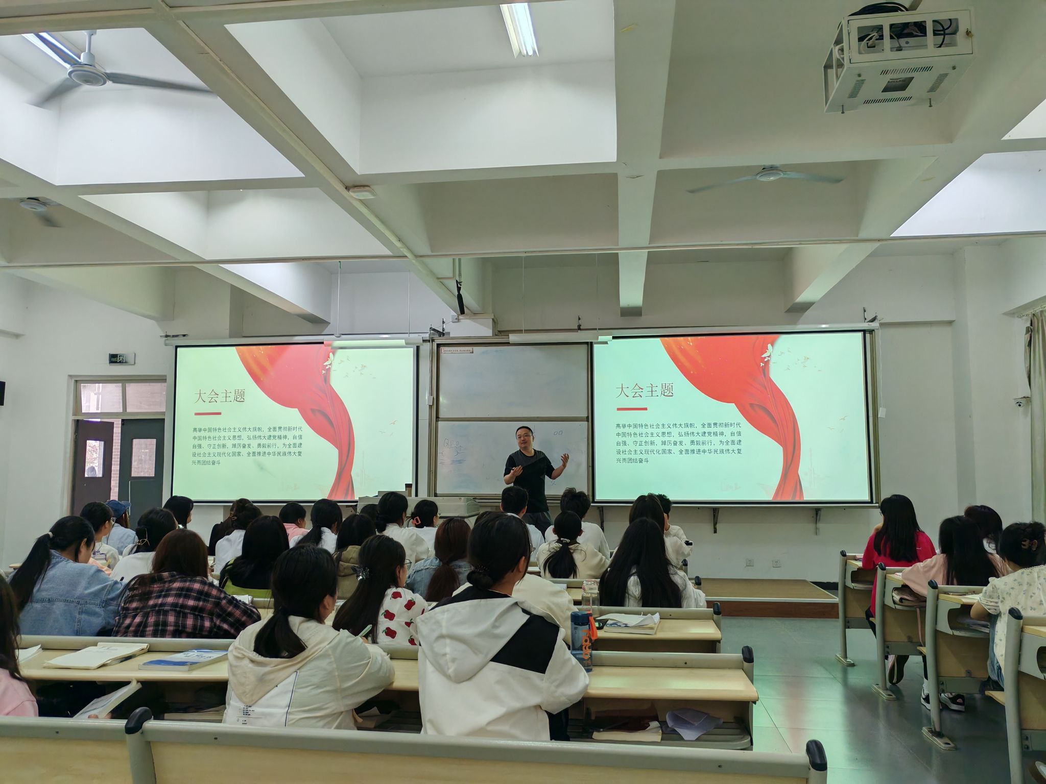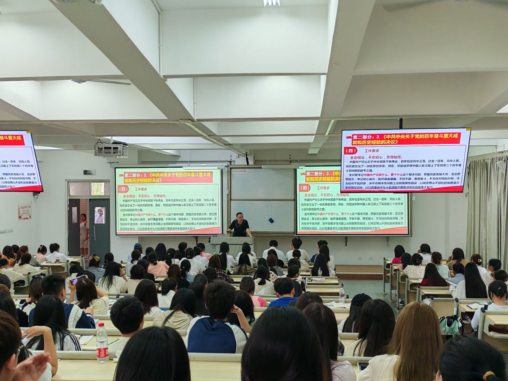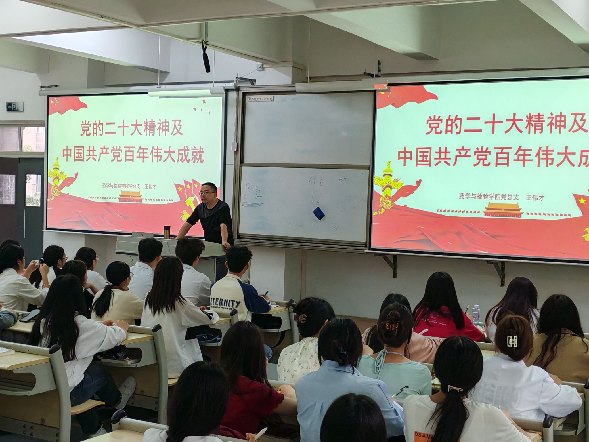 讲座中,王伟才老师首先通过观看电影片段带领大家共同回顾了党的一大历程,向大家详细解读了马克思主义传入我国后对革命前辈的影响、建党始末以及一大代表人生历程;讲座第二部分介绍了党的二十大报告的主要内容和要点;最后,通过对党的十九届六中全会审议通过的《中共中央关于党的百年奋斗重大成就和历史经验的决议》的解读,详细介绍了我们党的四个历史时期的主要任务、理论成果、重大成就以及党的百年伟大成就的五大意义和我们党经过长期实践积累的十条宝贵历史经验。
