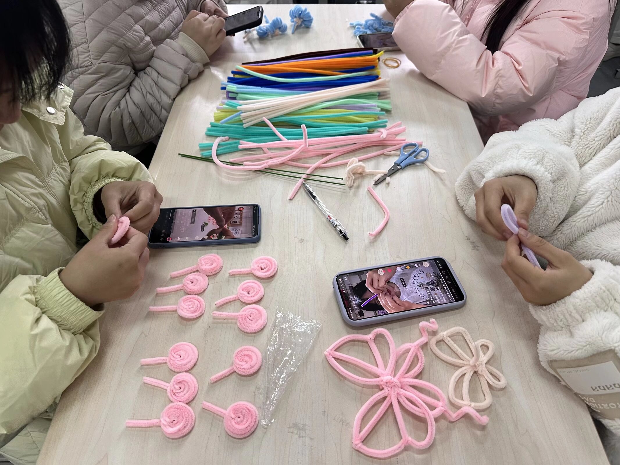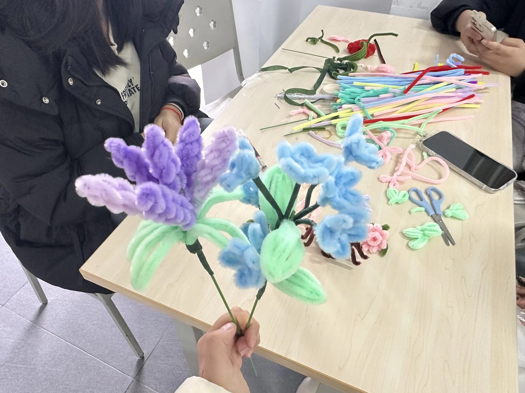 活动伊始,各色扭扭棒早已按色系整齐排列,静候着同学们的奇思妙想。同学们迅速组队,投入创作。起初虽有些许生疏,但在几位有手工经验同学的贴心分享与现场演示下,“对折绕圈”“分层配色”等小技巧迅速传递开来,大家很快便掌握了要领,兴致盎然地开始了自己的创作。