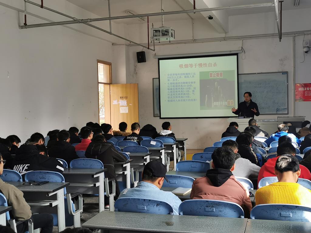 为了让各位同学了解到吸烟与喝酒对人体的危害,从而警醒自己注意身体健康,共创无烟和谐校园。12月10日下午13:00,药检公司在青年路图附102教室开展了《吸烟与喝酒对人体的危害》的讲座,讲座由药检公司党总支书记杨泽刚老师主讲,70余人参加此次讲座。