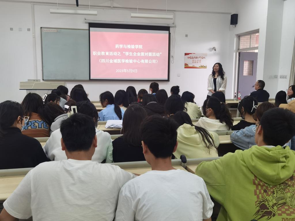 为更好地帮助员工做好职业生涯规划,提高公司员工就业质量,5月9日,药检公司“员工企业面对面”活动在经开区校区1107教室成功举行。此次活动采用“企业宣讲+现场面试”的形式,特邀四川金域医学检验中心有限公司招聘专员孟奕帆、技术部经理张杨,与公司医学检验技术2021、2022级员工进行了现场面对面的交流。